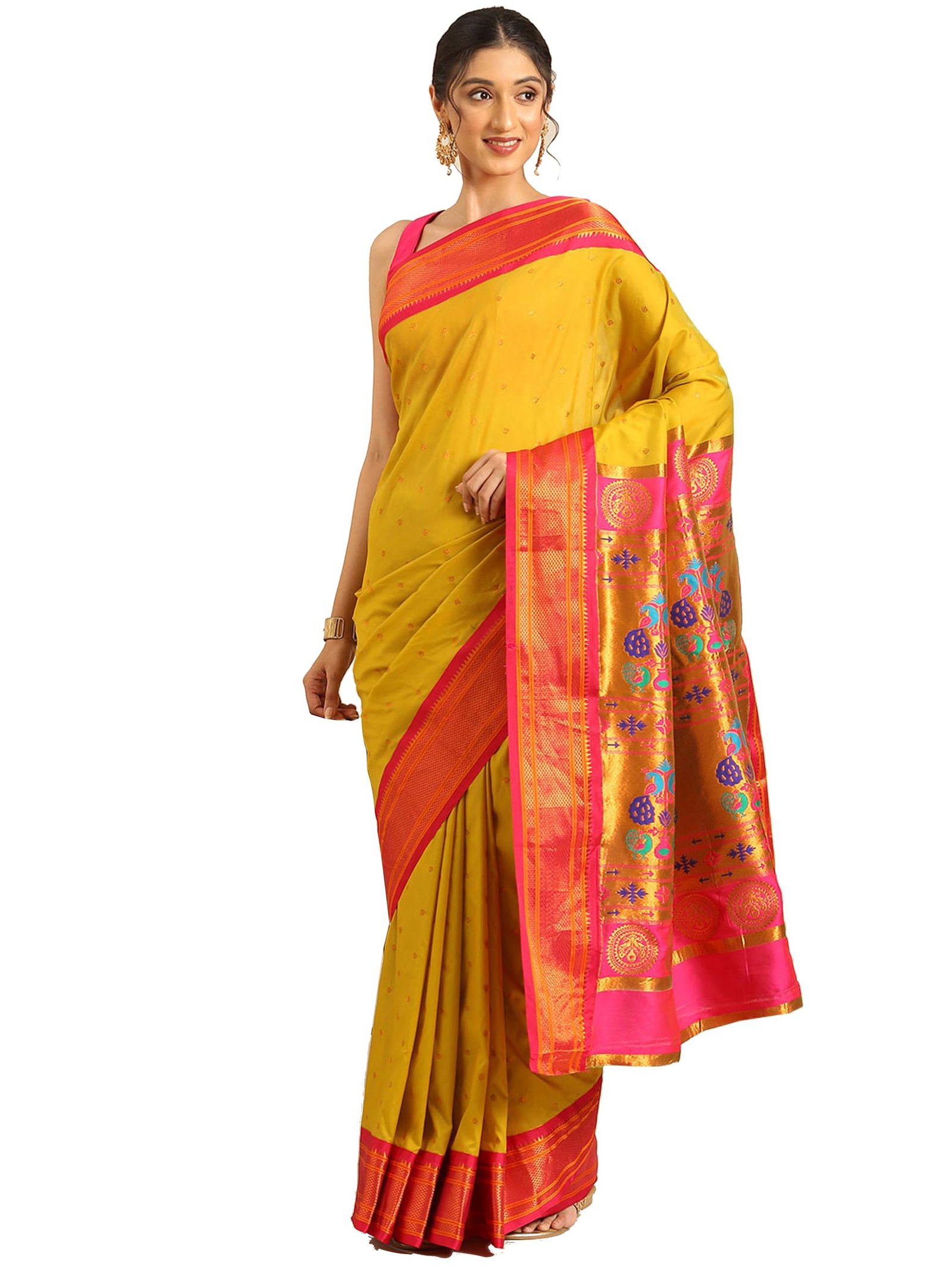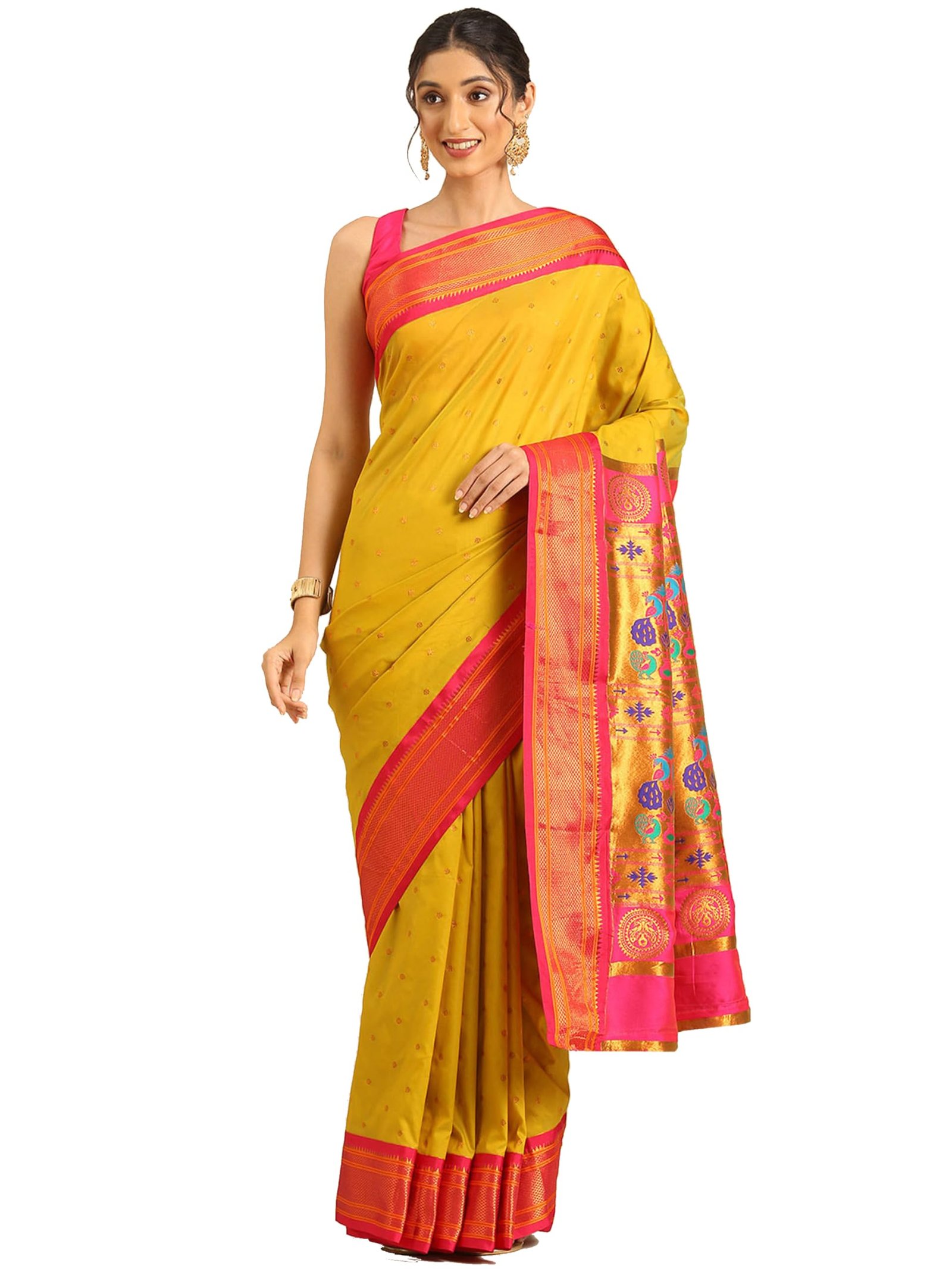 - Perfect Fit with Blouse Piece: Includes a 5.5-meter saree, also known as a 6-yard Sahavari Paithani, suitable for all body types, along with a 0.8-meter unstitched blouse piece to be stitched as per your preference.