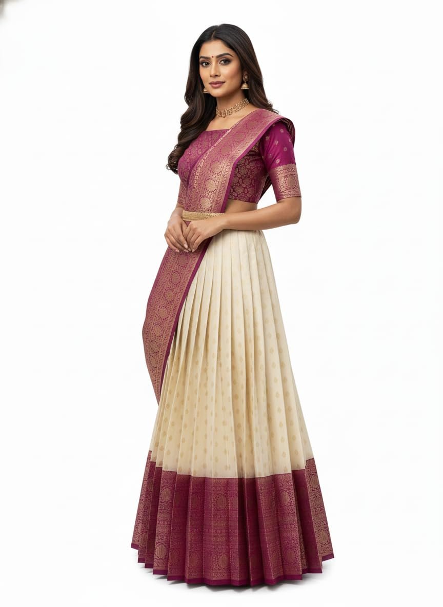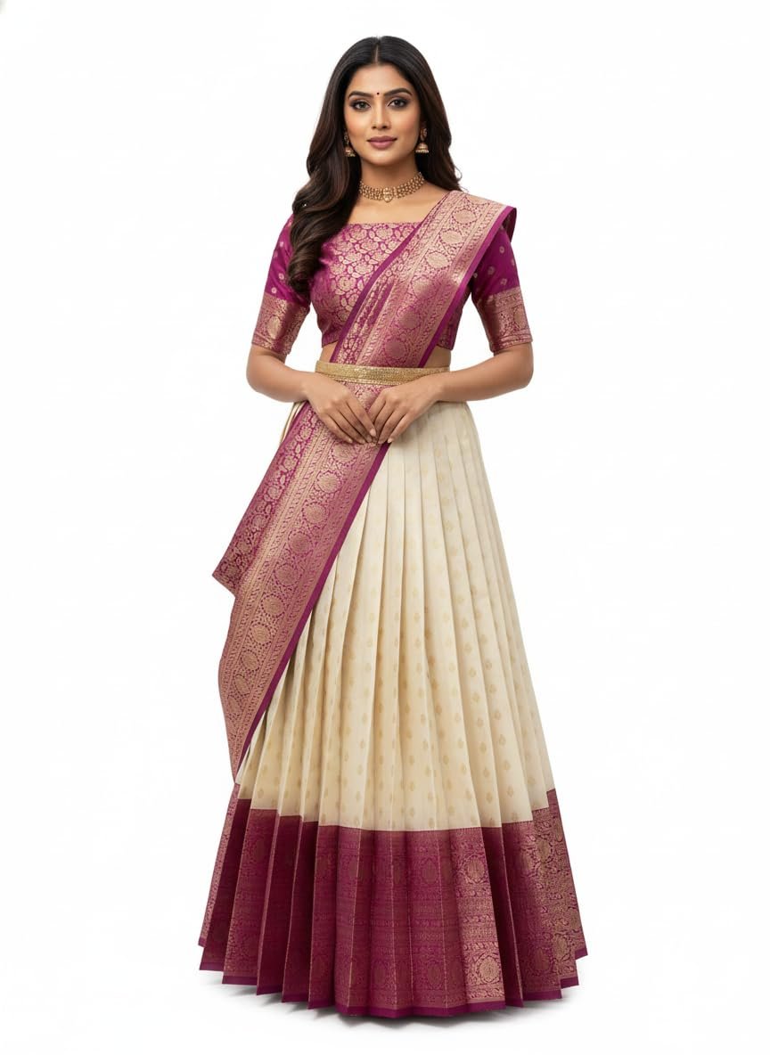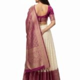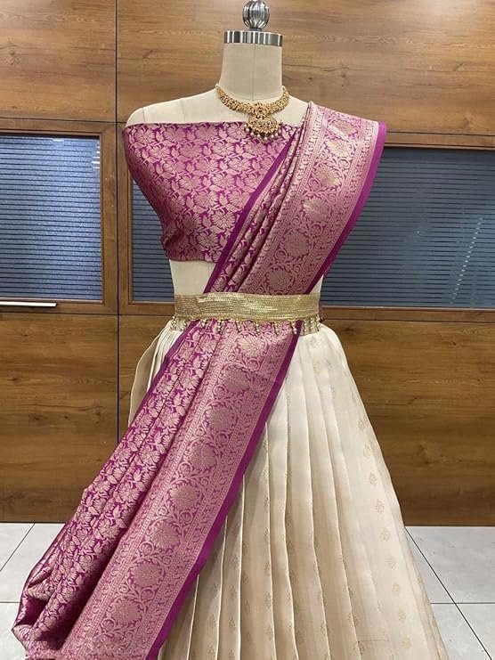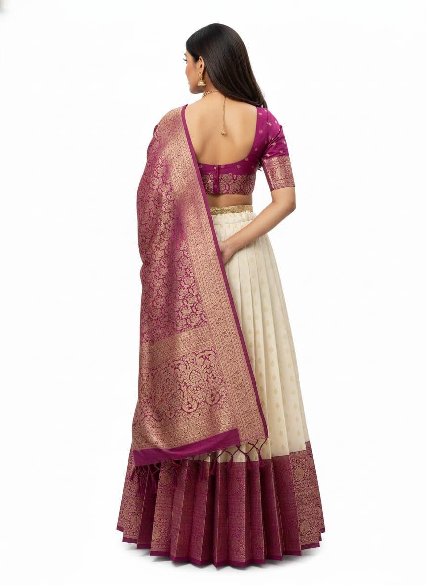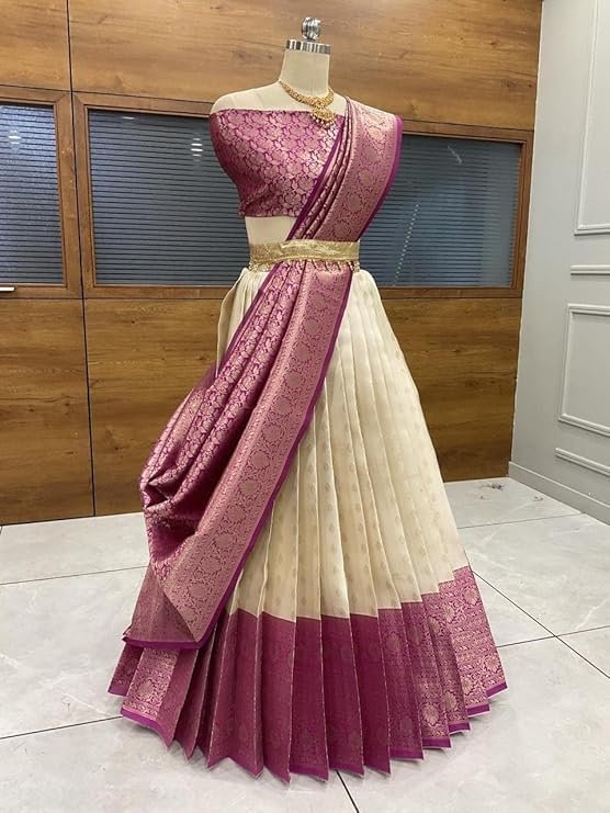 Introducing the exquisite Women’s Indian Traditional Unstitched Kanjivaram Kanchipuram Silk Pure Zari Weaving Lehenga Choli, accompanied by a Dupatta and an Unstitched Blouse Piece. Embrace the essence of timeless elegance and celebrate the rich heritage of Indian craftsmanship with this mesmerizing ensemble. Crafted with utmost care and precision, this Kanjivaram Kanchipuram Silk Lehenga Choli embodies the epitome of traditional Indian fashion. The pure silk fabric, renowned for its lustrous texture and luxurious feel, drapes gracefully and enhances your feminine charm. Each intricate detail is meticulously handwoven using the finest quality zari threads, creating a captivating interplay of shimmer and artistry. The Lehenga features a voluminous, flared silhouette that exudes grace and grandeur. Its exquisite zari weaving showcases intricate motifs inspired by Indian culture, adding a touch of regal opulence. The Choli, designed with a flattering neckline and tastefully crafted sleeves, perfectly complements the Lehenga’s allure. The set includes an Unstitched Blouse Piece, allowing you to customize it to your unique style and measurements.