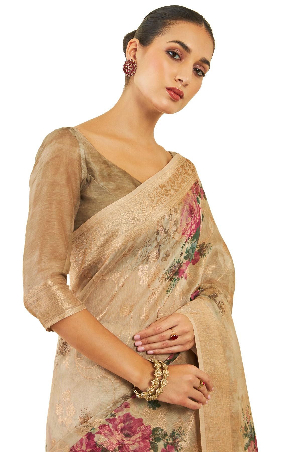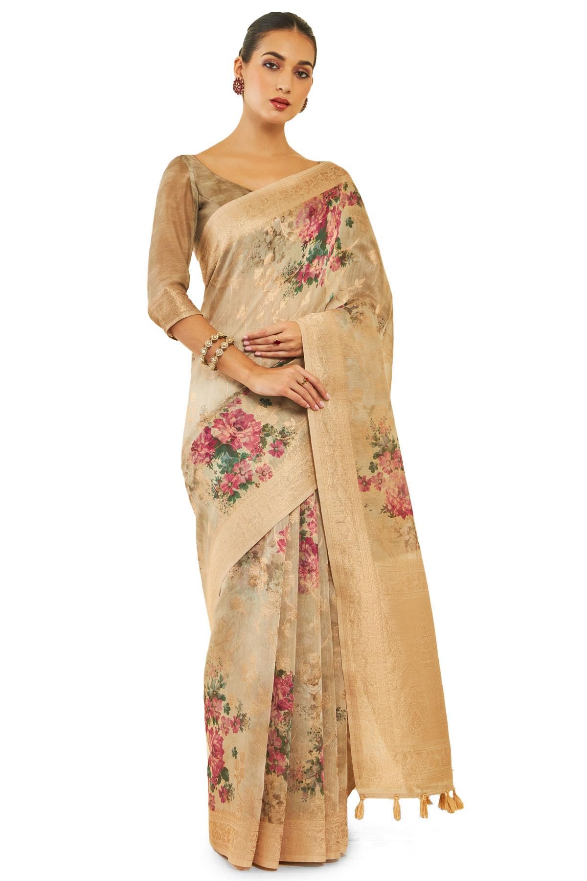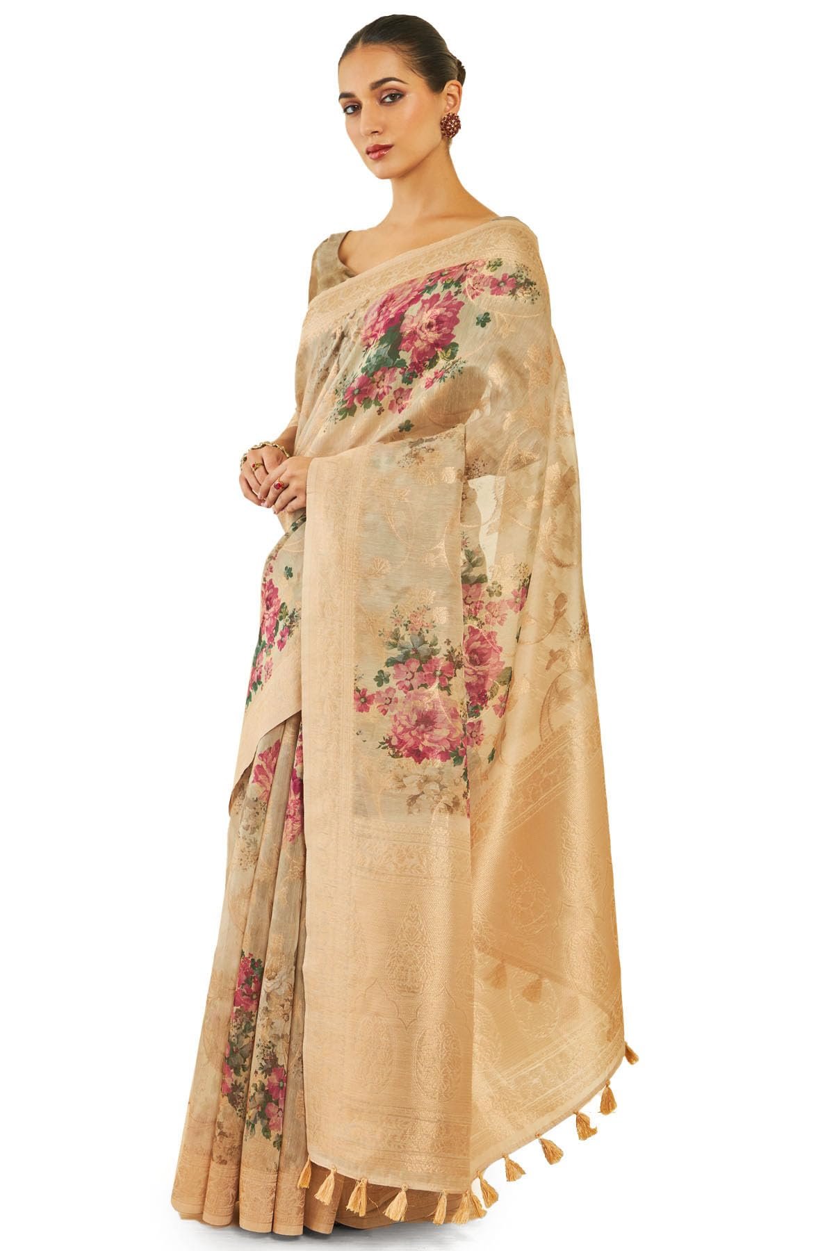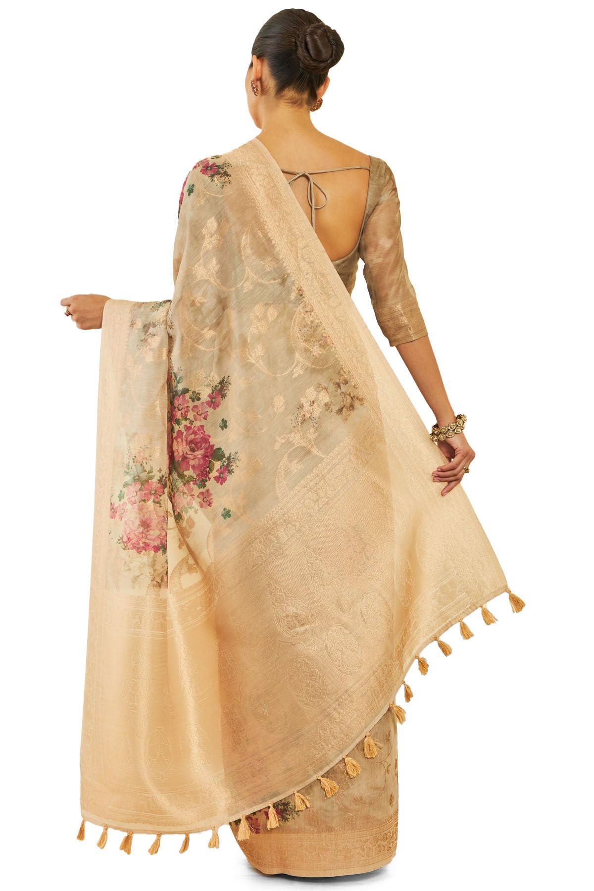 Discover newfound sophistication with our beige tussar silk saree. Adorned with a graceful floral print and floral zari woven designs, it instantly magnifies your feminine allure. The utmost attention has been paid to detailing with zari woven designs cleverly intermingled in the saree’s borders and pallu. The small element of surprise in the form of tassels in the pallu adds to its flirtatious charm. We provide an unstitched blouse piece with the saree.