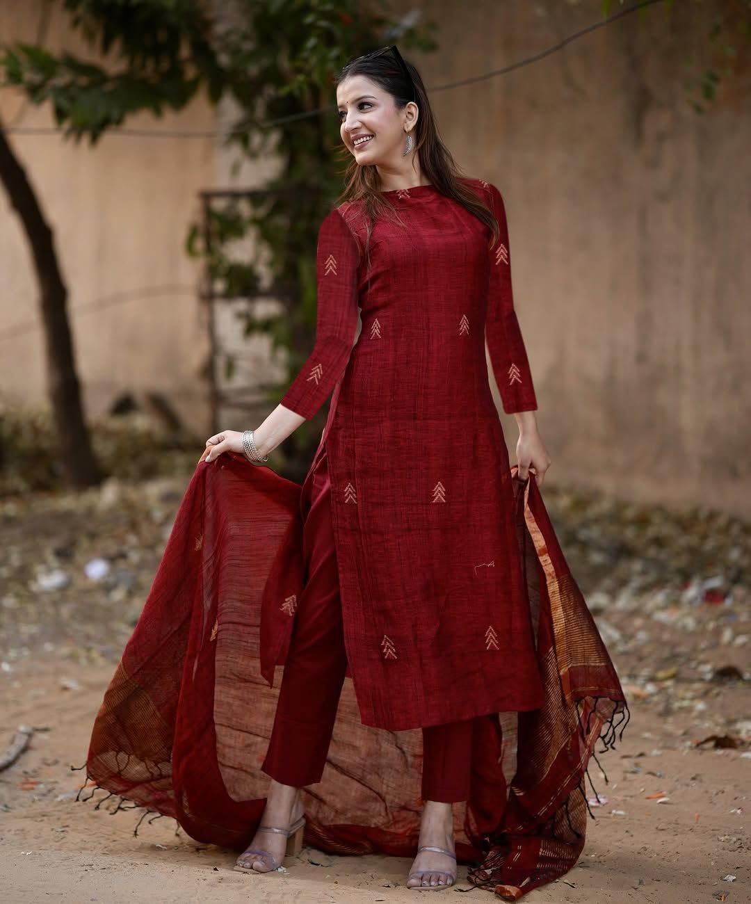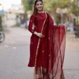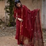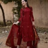 Enhance your ethnic wardrobe with the Pure Cotton Maroon Kurta Pant Set with Dupatta. This 3-piece cotton suit set for women includes a beautifully printed kurta, matching pants, and a dupatta, making it a versatile choice for any occasion. Made with breathable pure cotton fabric, this outfit is ideal for daily wear, office wear, and festive gatherings. The gold hand block print detailing adds a touch of elegance, making it a party wear kurta set for women latest design as well as a stylish festive kurta set. Whether you’re looking for a kurti pant set with dupatta, cotton kurta set for women, or co ord set for women stylish, this outfit checks all the boxes. It can be worn as a festive kurta set, casual kurti for woman, or ethnic dress for woman, giving you endless styling options. Pair it with juttis, heels, or flats to create a look that’s perfect for weddings, festivals, family functions, or daily wear. With its rich maroon color and gold accents, this kurta set with dupatta for women is a timeless addition to your ethnic collection.