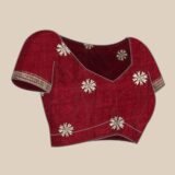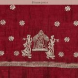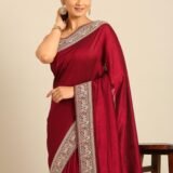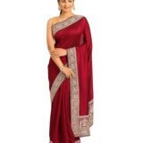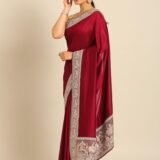 - Design: This royal wine-colored saree exudes opulence with its intricate doli baraat patterns along the borders. The rich hue and elaborate design make it a stunning choice for formal events with its horse patterned borders. Pair it with silver or pearl jewelry to enhance the sophisticated look, allowing the vibrant color and detailed patterns to take center stage for an elegant and regal appearance.